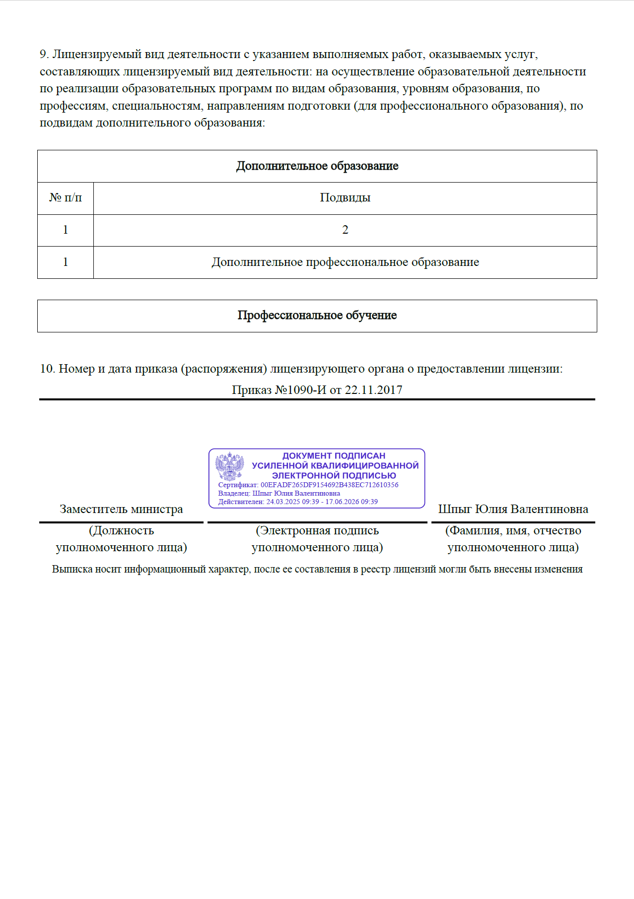 Выдана Министерством образования Воронежской области