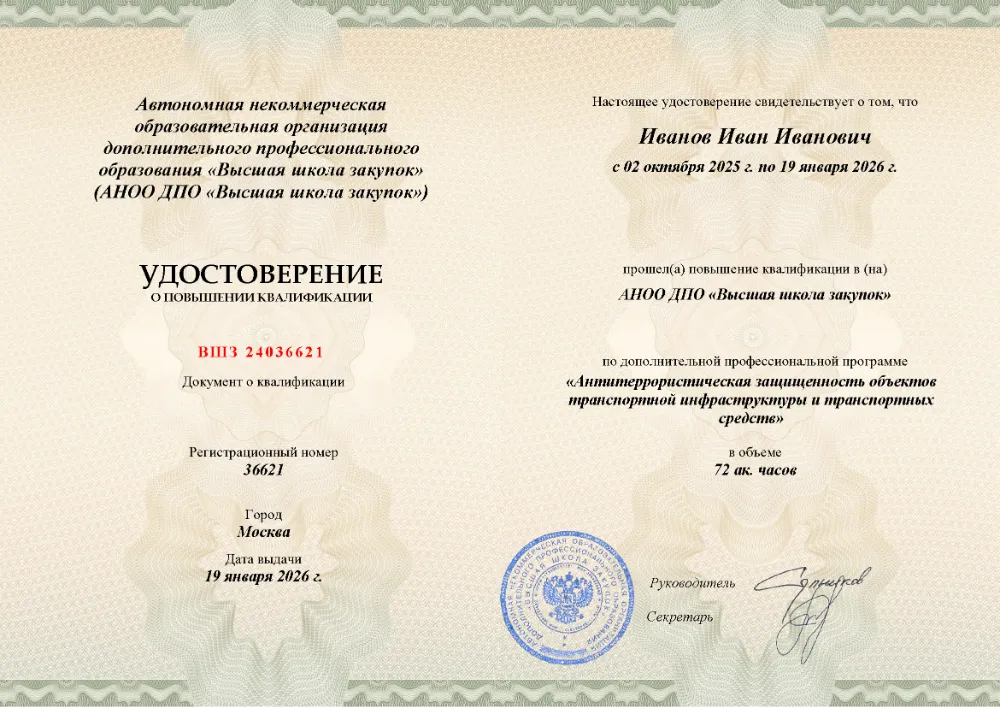 Повышение квалификации, 72 академических часа, 7 модулей: нормативно-правовые основы и угрозы в сфере образования, обязанности ответственных лиц, инженерно-техническая укрепленность объектов, анализ уязвимости, документооборот и действия персонала при ЧС. Онлайн-обучение в в Томске с итоговой аттестацией.